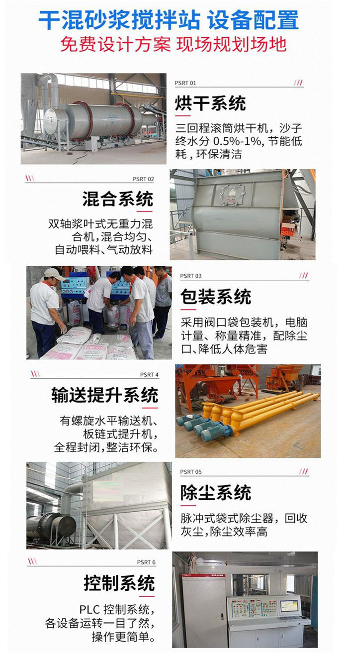 該套生產(chǎn)線由砂子烘干系統(tǒng)及預(yù)拌砂漿混合系統(tǒng)兩部分組成。主要包含:砂子烘干系統(tǒng)、篩分輸送系統(tǒng)、原料儲存系統(tǒng)、高效混合系統(tǒng)、自動配料系統(tǒng)、氣動平衡系統(tǒng)、除塵系統(tǒng)、袋式包裝系統(tǒng)、散裝罐車專業(yè)包裝系統(tǒng)以及PLC自動控制系統(tǒng)等。